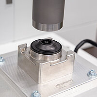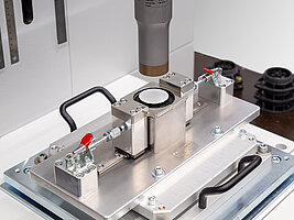 Um die exakte Zentrierung des Fügepartners in der Applikation sicherzustellen, entwickelte man eine individuelle Haltevorrichtung, die in die Werkstückaufnahme integriert wurde. Sie erleichtert es dem Benutzer am Handarbeitsplatz, die Membran ideal für den Schweißprozess zu positionieren und verhindert ein Verrutschen des Fügepartners.