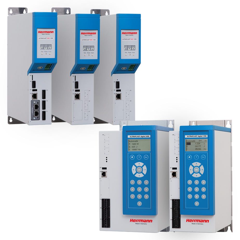 Leistungsstarke Ultraschallgeneratoren für getaktete Applikationen – die digitale ULTRAPLAST Produktbaureihe ist in den Frequenzen 20 kHz, 30 kHz und 35 kHz mit einem Leistungsspektrum von 900 W bis 6200 W erhältlich. Programmierbare Ein- und Ausschwingzeiten und stufenlos einstellbare Schweißamplituden sind nur einige Merkmale dieser Baureihe. Der Ultraschallgenerator ULTRAPLAST digital kommt in allen Herrmann Ultraschall Serienmaschinen und Systemen zum Einsatz.