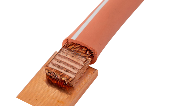 Orange-isolated copper cables with exposed stranded ends connected to flat copper busbars.